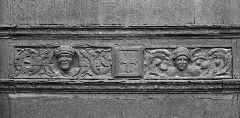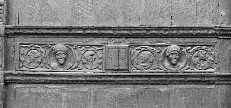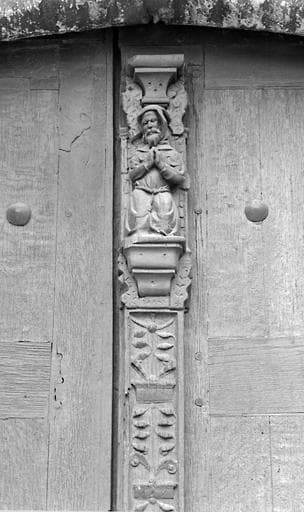 La porte à deux vantaux du portail central est constituée d'un assemblage de planches de chêne renforcées par des clous. Le décor en bas et demi-relief est concentré en deux frises, sur le montant central et sur un bandeau horizontal.