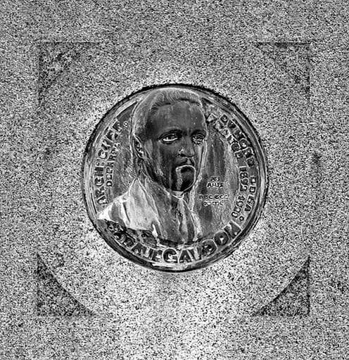 Tombeau en pierre avec médaillon en bronze, en bas-relief, représentant le défunt.