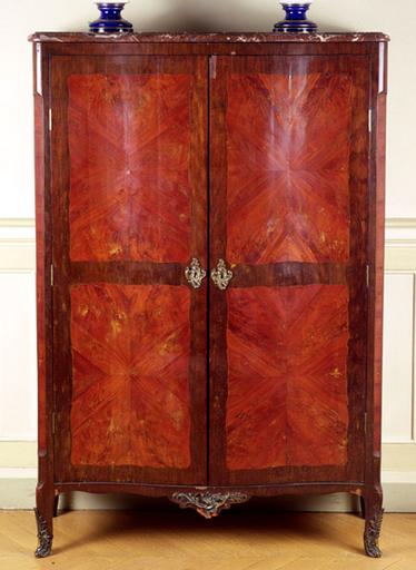 Armoire droite à deux battants, sur 4 pieds chantournés. Bâti en chêne et placage en bois exotiques. Dessus en marbre rouge veiné. Trois appliques en bronze (serrures et partie basse).