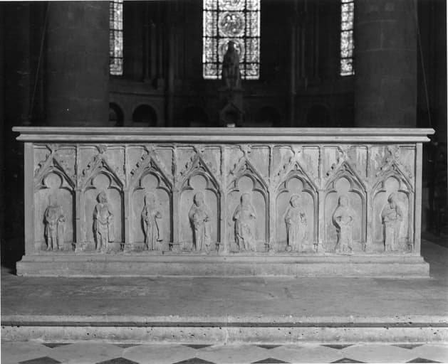 Ensemble de huit personnages (saints et saintes ?) placés sous arcatures trilobées ornées de fleurons et de crochets.