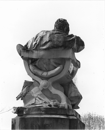 Meissonier est assis se tenant la tête de la main droite. Devant le socle sont posés un étendard, une couronne de lauriers et une épée.