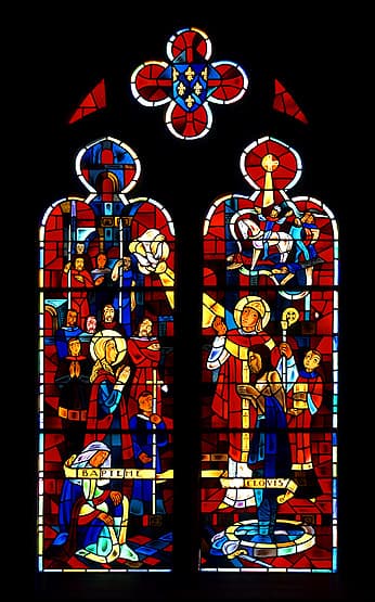 POP | Plateforme ouverte du patrimoineensemble de 5 verrières : Sacré-Coeur, Baptême de Clovis, translation des reliques de Sainte Honorine, saint Maclou fonde Saint-Malo, sainte Honorine délivre les prisonniers