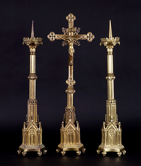ensemble de 8 chandeliers et de 2 croix d'autel de style néo-gothique