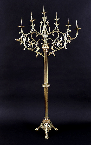 chandeliers à 7 branches. Les trois pieds sont terminés par des griffes et ornés de rinceaux percés. Le noeud est très mince. la partie destinée à recevoir le luminaire est composée de deux grands rinceaux.