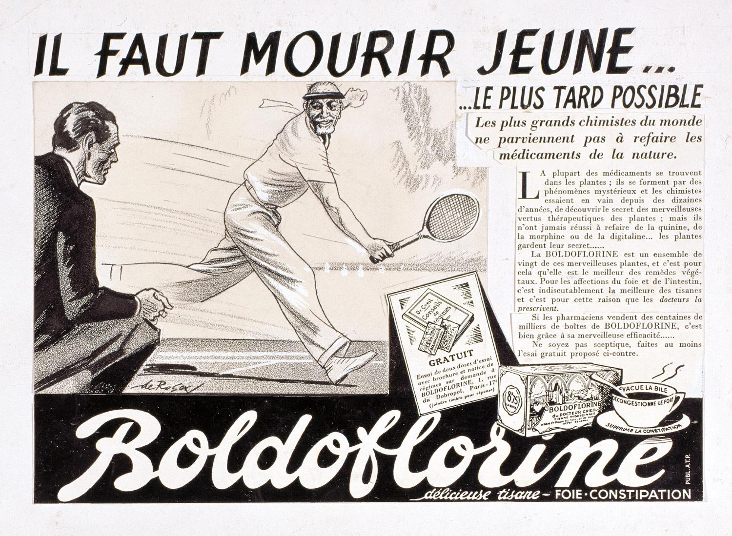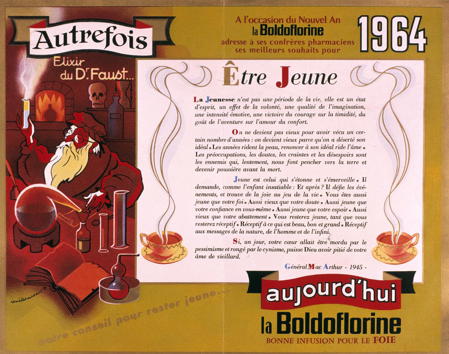 Ensemble de projets, de documents publicitaires (affiches, encarts de presse, dépliants, cartes de voeux) et d'éléments de packaging ventant les mérites des tisanes Boldoflorine, Calmiflorine et Saliflorine, réalisés de 1937 à 1965. 'Il faut mourir jeune... le plus tard possible', Un mouton sauve la vie de milliers de personnes', 'En Chine, les bourreaux vendent la bile...', Grand concours de la vedette inconnue', Boldoflorine régulateur du foie', 'L'homme est une machine vivante', 'Service de publicité par tableaux exposés en vitrine', 'Il était une fois, dans la ville de Foix', 'Ne vous replâtrez pas le visage !', 'Rien que des plantes', 'Le Bon Dieu qui s'y connait n'a pas créé les plantes que pour les chiens', 'Ambulance officielle du tour de France', 'carte postale, franchise militaire', 'Gloire aussi à la ...', 'Long live the queen', 'Blodoflorine, la bonne tisane pour le foie', 'Autrefois elixir du Dr Faust.. aujourd'hui la Boldoflorine', 'Boldoflorine au service de sa majesté le foie', 'La Boldoflorine à la manière de notre bon La Fontaine, le pharmacien et ses enfants'. Le fonds documentaire de l'entreprise Fouché a rejoint les collections du Fonds de dotation pour la gestion et la valorisation du patrimoine pharmaceutique en 2017.