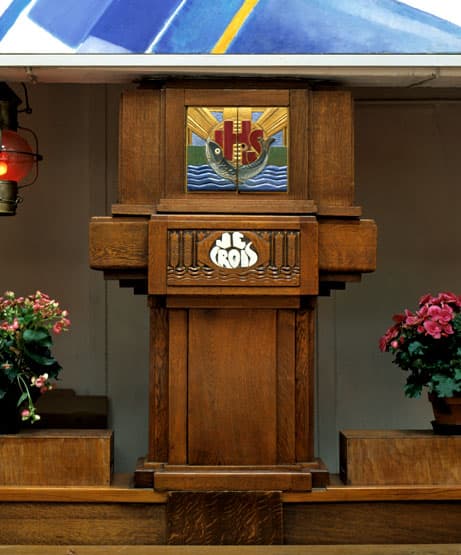Le tabernacle repose sur un haut socle de section cruciforme dont la partie supérieure est sculptée en méplat avec des ajoncs et de l'eau autour de l'inscription 'je crois'. Les portes du tabernacle sont sculptées en méplat et peintes. On y voit un poisson, de l'eau, la terre et des rayons lumineux.