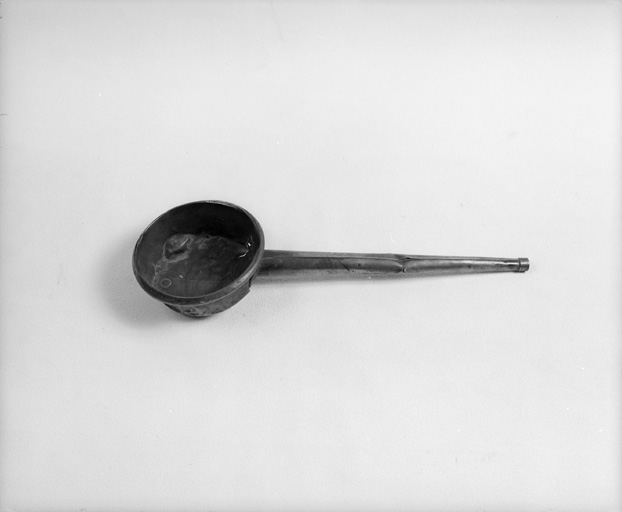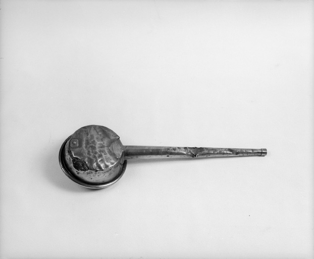 Réceptacle cylindrique bordé d'un bourrelet, manche conique, tubulaire et creux, soudé au réceptacle par une collerette évasée et terminé de l'autre côté par un embout en cuivre ; la paroi du réceptacle est percée de trois trous disposés en triangle, permettant d'évacuer l'eau par le manche.