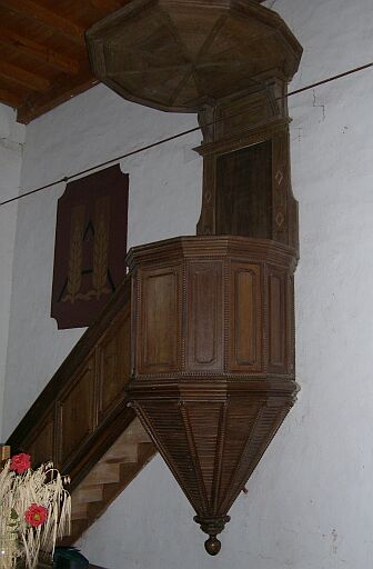 Chaire adossée pourvue d'une cuve octogonale sur culot desservie par un escalier droit, dorsal plat surmonté d'un abat-voix plat à 10 pans.