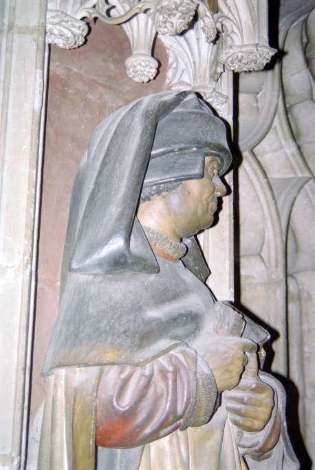 saisi sur le vif.£Il porte un costume simple. Son manteau blanc s'enrichit d'un large liseré de couleur rouge en accord avec le fond de la niche dans laquelle il est placé. Fermé, ce vêtement présente deux larges fentes latérales par lesquelles Sophonie sort ses bras. Ses épaules sont largement recouvertes d'un rabat de couleur sombre sur lequel de nombreuses traces d'outils (ciseaux et râpes) sont visibles.£Sa chevelure disparaît sous un large chaperon dont les plis savants tombent sur ses épaules. Sous son ample manteau blanc, Sophonie cache une longue robe rouge doublée de fourrure. Cette dernière apparaît au niveau des manches retournées à leur extrémité et au niveau du col où la fourrure constitue un véritable collier mettant en valeur le visage rond du prophète.