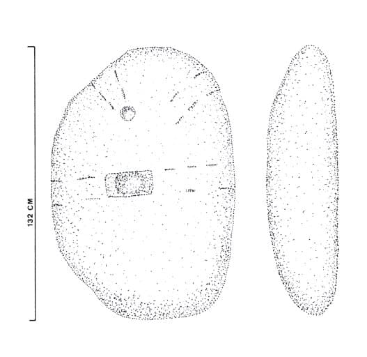 Statue taillée dans un bloc de gneiss granitoïde. Elle a une forme ovale, sa face est bombée et son dos assez plat et irrégulier, les bords sont arrondis.