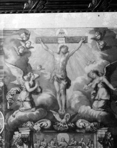scène biblique (Cène, Abraham : sacrifice, Melchisédech : sacrifice, Multiplication des pains, la Manne) ; figure biblique (Christ en croix, saint : doctrine, martyre)£figure biblique (saint Jean, Patmos, livre, Apparition à la Vierge)£scène biblique (Lavement des pieds)