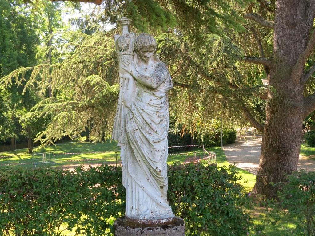 Vêtu à l'antique, ce personnage féminin soulève un vase au décor délicat.