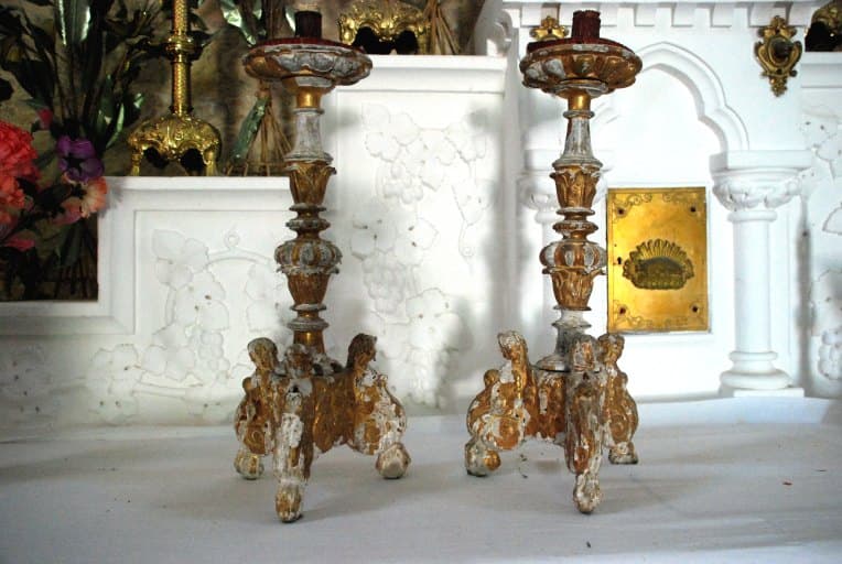 Il s'agit de deux grands chandeliers en bois doré, tripodes, à tige balustre.