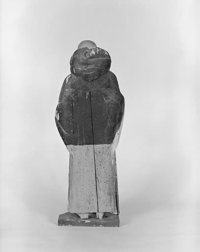 Socle rapporté à pans coupés.£Partie inférieure du revers non peinte ; statue constituée de plusieurs éléments collés, dont quatre sont visibles au revers ; assemblage du socle et de la statue par collage
