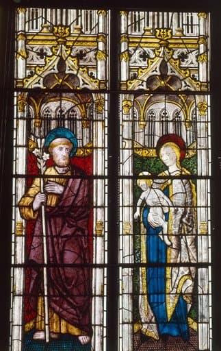 verre transparent (coloré) : peint, grisaille sur verre ; plomb (réseau)