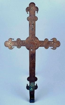 Manquent le Christ en croix sur la face, des pierres ou autres ornements à l'extrémité des bras (trous de fixation)
