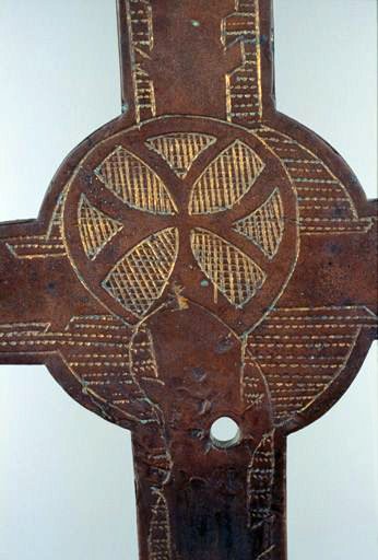 Croix limousine de type croix florencée à renflement précédant les fleurons ; comportait sans doute, comme les croix de Courteix (canton d'Eygurande) et d'Argentat, un Christ de petite taille, à couronne, et peut-être émaillé, dont la tête s'appuyait sur le nimbe décentré ; devait aussi comporter d'autres éléments de décor rapportés et fixés aux extrémités à hauteur des fleurons ; le revers est plus travaillé que celui de la croix de Courteix ; à rapprocher aussi de la croix de Soudeilles (canton de Meymac).