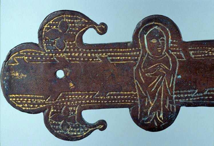Sur la face une croix en forme de tronc écoté sur laquelle devait se trouver un Christ en croix, sur les bras de la croix la Vierge et saint Jean ; au revers, Christ bénissant dans le cercle d'intersection d'où partent des suites de rinceaux.