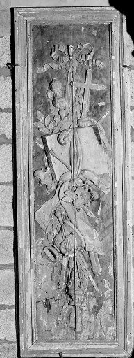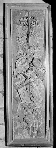 Panneau à gauche du choeur : de bas en haut, lampe de sanctuaire, burettes, manipule, livre ouvert, patène, calice, ciboire, croix d'autel, colombe, grappe de raisin, blé, ornement à noeud. Panneau à droite du choeur : de bas en haut, encensoir, seau à aspersion, épées, manipule, chandelier, livre ouvert, croix d'autel, branche de laurier ou d'olivier (?) panneaux de bâtons processionnels, noeuds de rubans.