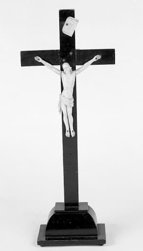 Christ en ivoire monté sur une croix en bois fruitier teinté en noir.