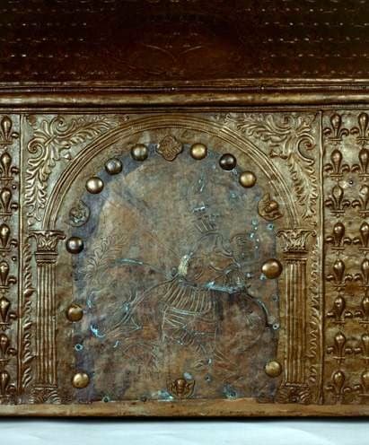 bois : peint, polychrome ; cuivre : repoussé, estampage, ajouré, découpé, ciselé