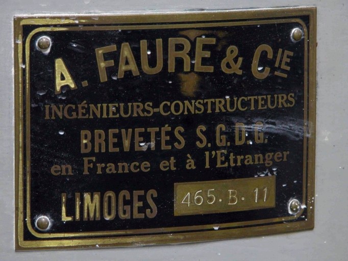 Inscription concernant le fabricant : Faure et Cie, ingénieurs-constructeurs brevetés S.G.D.G. en France et à l'étranger, Limoges, 46-57, 46-56.