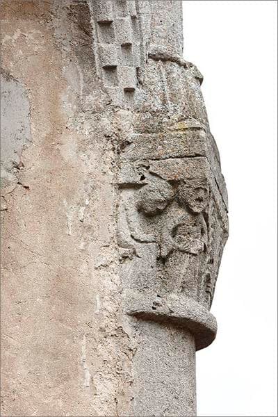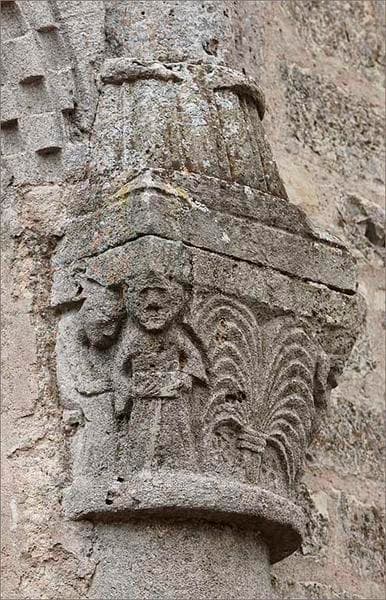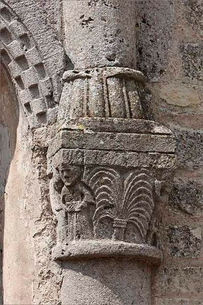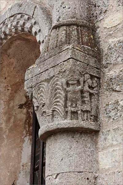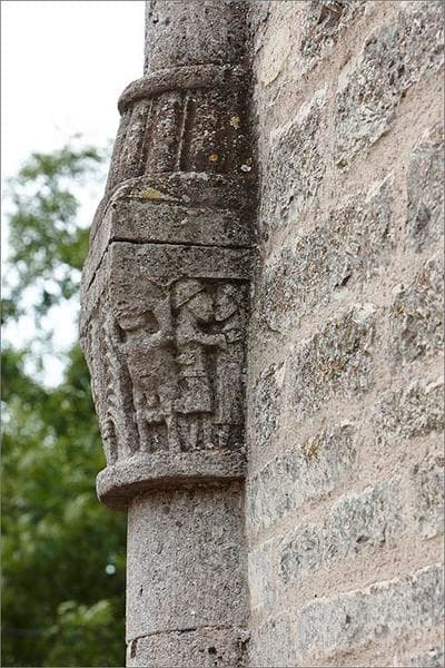 Situé à droite de la baie centrale, ce chapiteau est le seul chapiteau historié du chevet. Il représente deux groupes de personnages de part et d'autre d'une sorte de bouquet de branches nouées qui pourrait évoquer un palmier, symbole de la Résurrection et de victoire sur la mort, ou un jet d'eau, symbole de la vie et du baptême. A gauche, un homme, de face, tient un livre ouvert ; à ses côtés, une femme est assise, tête baissée et mains jointes dans une attitude de prières. A droite, un couple s'embrasse à côté d'un grotesque personnage nu qui étire sa bouche avec les mains. Ces scènes ont une portée symbolique et, dans une certaine mesure, une visée injonctive : d'un côté le Bien à travers la lecture de la parole divine et la prière, de lautre côté le Mal à travers la tentation et la luxure.