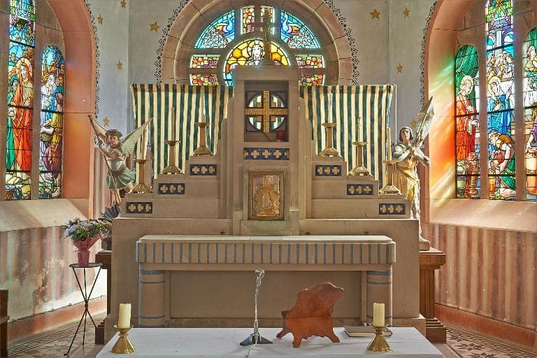 Autel, retable à gradins et tabernacle de style Art déco en pierre blanche incrustée de carreaux de faïence émaillés et de mosaïques bleu et or.