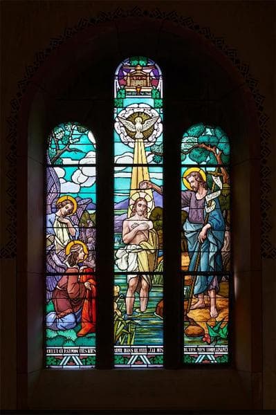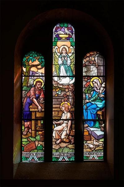 Ensemble de 9 verrières composé d'un oculus et de 8 verrières à 3 lancettes. Les sujets représentés sont : verrière du chur (rose) 0 : la Cène entourée de fruits, paons et cerfs, 1 : la multiplication des pains, 2 : les noces de Cana ; verrières de la nef, 3 : Notre-Dame de la Maix, 4 : la sainte Famille, 5 : sainte Jeanne d'Arc entendant les voix, 6 : scène de la 1ère guerre mondiale, 7 : baptême du Christ, 8 : L'Enfant prodigue.