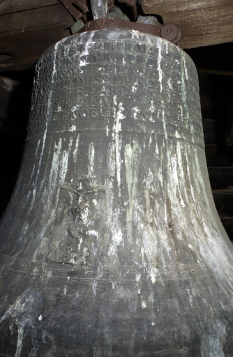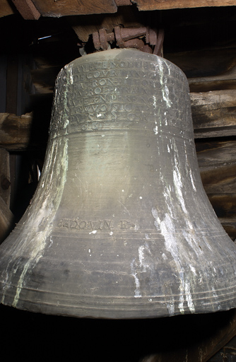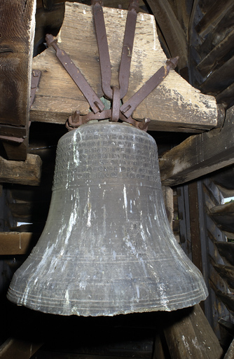 Cloche à 6 anses, mouton en bois, baudrier en cuir, battant piriforme troué en fer. Inscription sur 7 lignes avec mains initiales à la partie supérieure du vase, lettres sur dossiers.