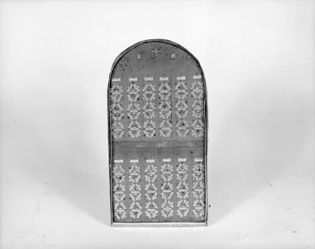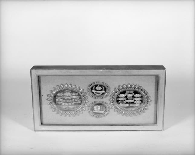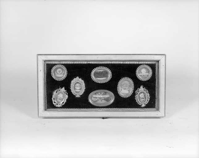 Cadres en bois dans lesquels sont présentés une relique (fragment de tissu, ossement) ou un certain nombre de médaillons ; 4 cadres contiennent une riche ornementation intérieure de paperoles ; 2 s'organisent autour d'une miniature centrale ; les médaillons, ronds ou ovales, sont en argent, cuivre ou laiton.