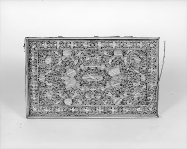 bois : taillé, doré ; tissu uni ; carton ; papier ; argent ; cuivre ; laiton