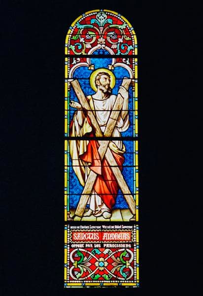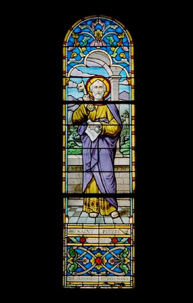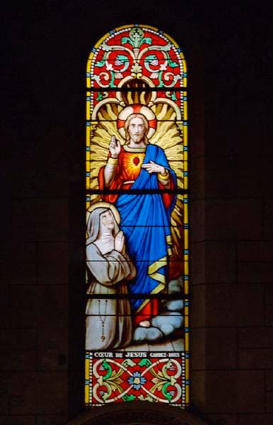 ensemble de 6 verrières à personnages : saint André, sainte Geneviève, Apparition du Sacré-Coeur à Marguerite-Marie, saint Joseph, saint Pierre, Notre Dame de Pellevoisin (baies 3 à 8)