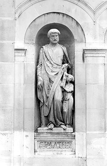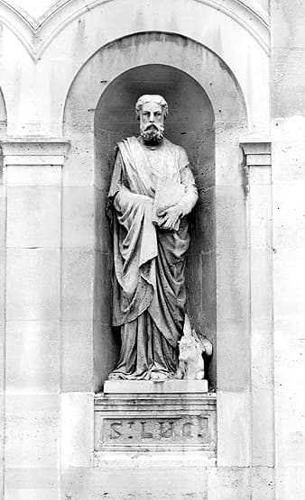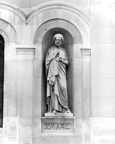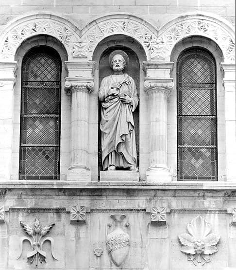 5 statues : les quatre évangélistes et saint Pierre, figure vêtue