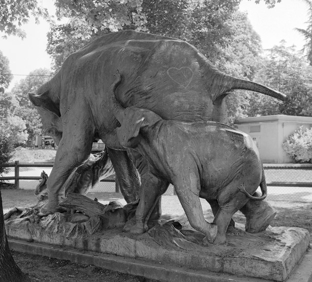 Groupe sculpté relié dit les éléphants attaqués par un tigre ; le plâtre du sculpteur Georges Gardet (justification par source) fut présenté au cours de l'exposition coloniale de 1931 ; acheté par l'Etat, il fut offert à la ville de Paris ; la réplique en fonte d'A. Durenne à Paris (signé) est prêtée à la ville de Choisy-le-Roi depuis 1952 ; elle porte le numéro d'inventaire 2367