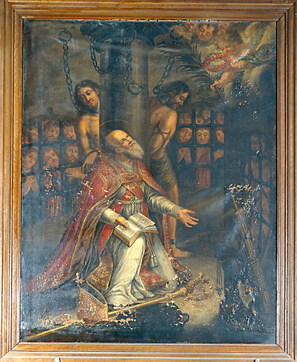 Saint Dominique de Silos, en habits sacerdotaux, la mitre et la crosse à ses pieds, implore à genoux le Ciel d'où deux angelots lui tendent une palme et une couronne de fleurs. Derrière lui, deux prisonniers sont enchaînés à une colonne. A l'arrière-plan, derrière des soupiraux grillagés, les captifs se joignent à l'imploration du saint.