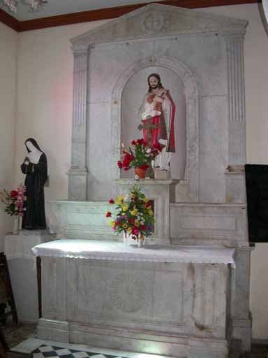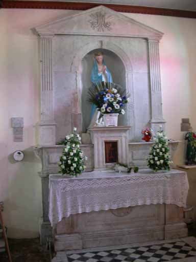 Autel architecturé composé d'un tombeau droit en plan et élévation. Gradin avec 2 ailettes en volutes. Retable avec niche. La niche cintrée est encadrée de deux pilastres cannelés, surmontés de deux fronton portant un coeur ardant avec guirlande de fleurs.