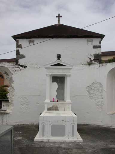 Tombeau en maçonnerie avec épitaphes en marbre. Le gradin est surmonté d'un fronton architecturé, supporté par 2 colonnettes cannelées, surmonté d'une croix pattée. L'épitaphe de marbre noir est cassée sur sa partie gauche.