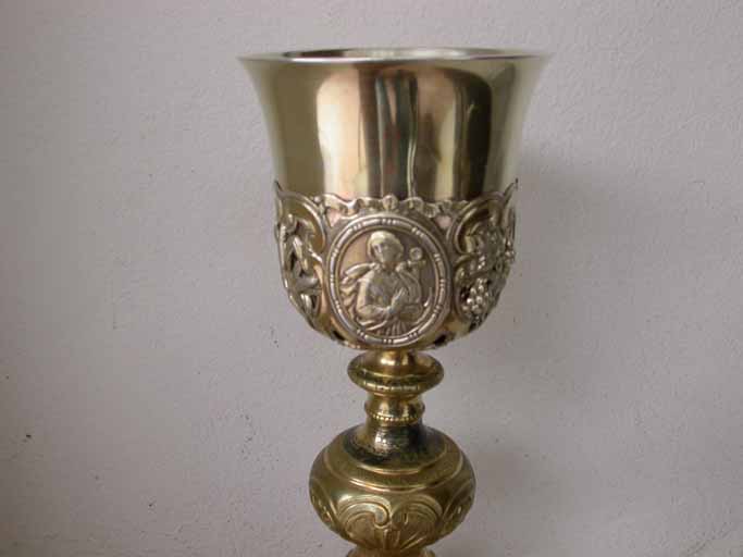 Sur la fausse coupe : Espérance, Foi, Charité dans médaillons. Socle : chérubins en alternance avec Dieu le Père et scène de la Passion du Christ. Bordure de pied : enroulements avec blé, coquille et symbole divin.