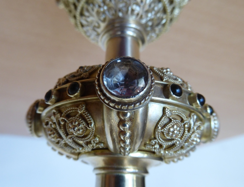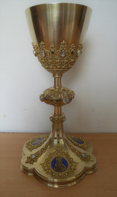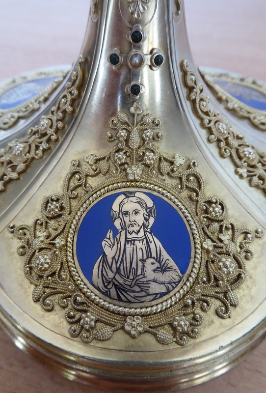 Calice composé d'un pied à six lobes, d'une tige à noeud aplati et coupe lisse et évasée ; trois émaux peints en médaillons sur le pied. La fausse-coupe composée de filigranes et de granulations est parsemée de cabochons incrustés de perles, pierres ou verres de couleur.