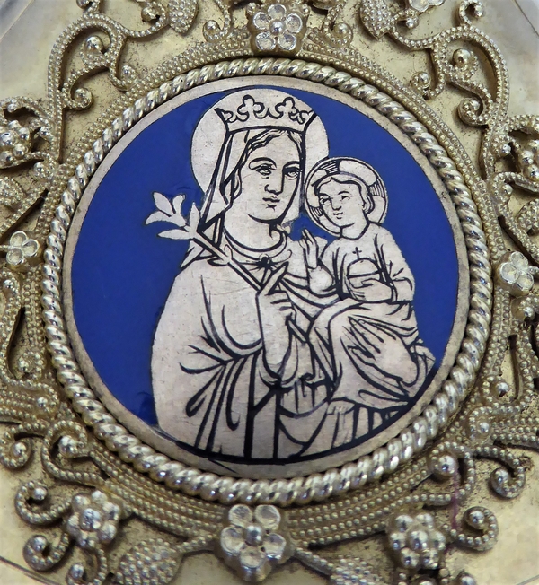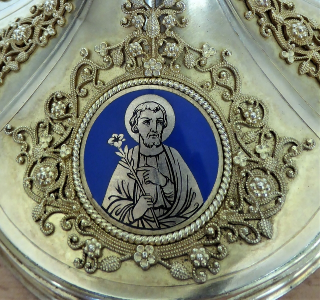 Le pied du calice est orné de médaillons émaillés entourés de motifs floraux et de pommes de pin, ils représentent le Christ bénissant, la Vierge tenant l'Enfant et une fleur de lys et saint Joseph tenant une fleur de lys ; au centre de la patène, l'inscription I.H.S. est entourée de rinceaux.