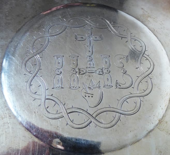I.H.S. surmonté de la croix, cœur transpercé par trois clous et 3 gouttes de sang ; ensemble entouré de la couronne d'épines.