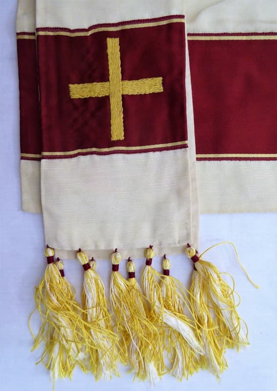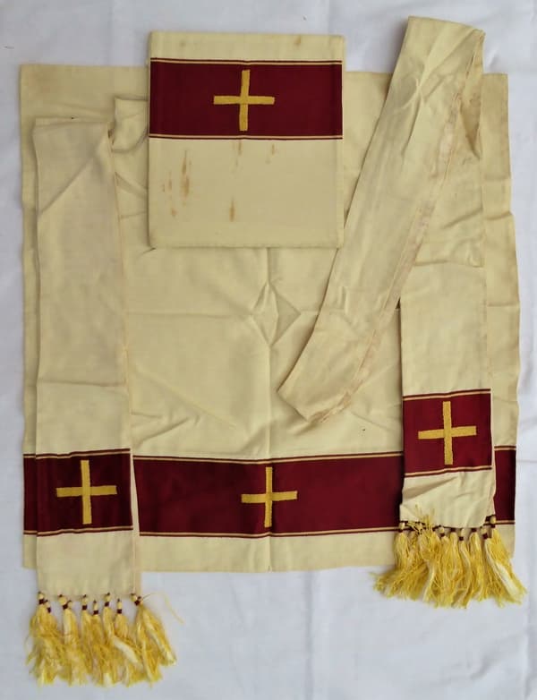 ornement blanc : étole, manipule, voile de calice, bourse de corporal