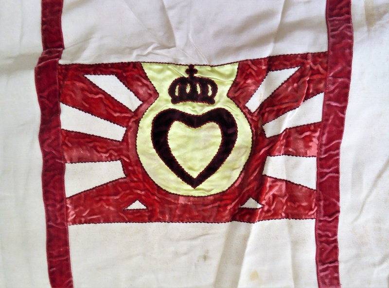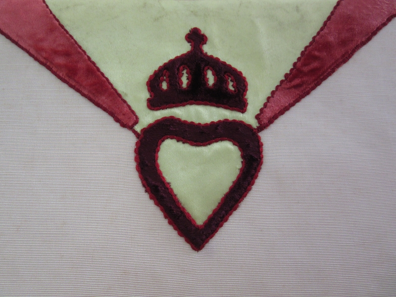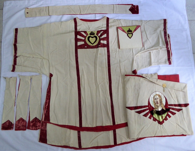 Les dalmatiques sont ornées d'un cœur couronné rayonnant d'un côté et de l'autre du chrisme (PX). Le voile huméral porte la représentation du Christ du Sacré-Cœur assorti de rayons et le monogramme AM. Le fermail comporte le chrisme (Pax, alpha et oméga).