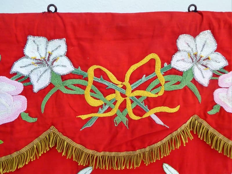 Bannière à lambrequins. Le tissu de fond est en toile de coton rouge ; Le décor se compose de broderies d'application en fil de soie polychrome (vert, blanc, violet, ocre). Les médaillons au centre de chaque côté sont des applications de soie peinte. Passementerie : galon, franges et glands sont en fil métal doré.