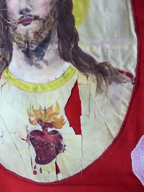 fleur de lys ; grappe de raisin ; épi de blé ; Christ du Sacré-Cœur : buste ; calice de l'Eucharistie