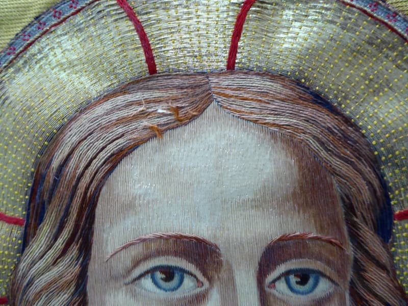 velours : brodé ; soie : application sur textile brodé, fil (polychrome) ; drap d'or ; fil métal : doré, argenté