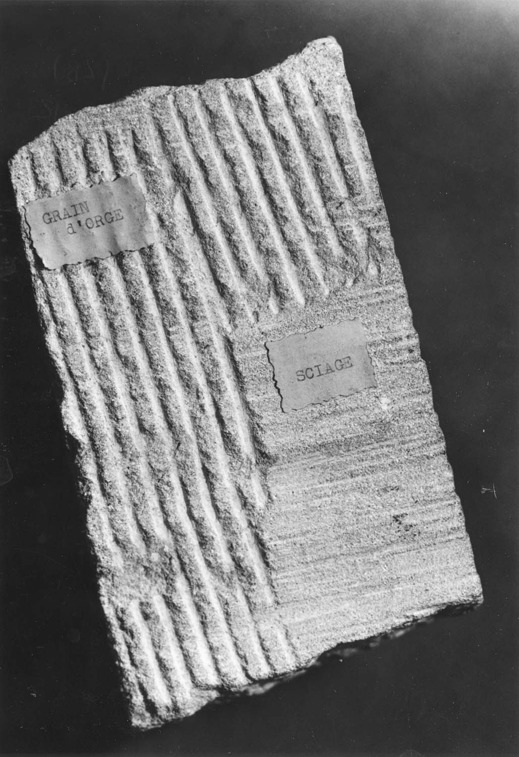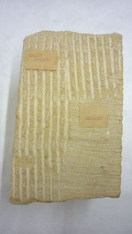 POP | Plateforme ouverte du patrimoineDifférentes traces modernes de tailles de pierre et sciage, sur chaque face du bloc de pierre : taillant droit, chemin de fer, bretture, grain d’orge, sciage