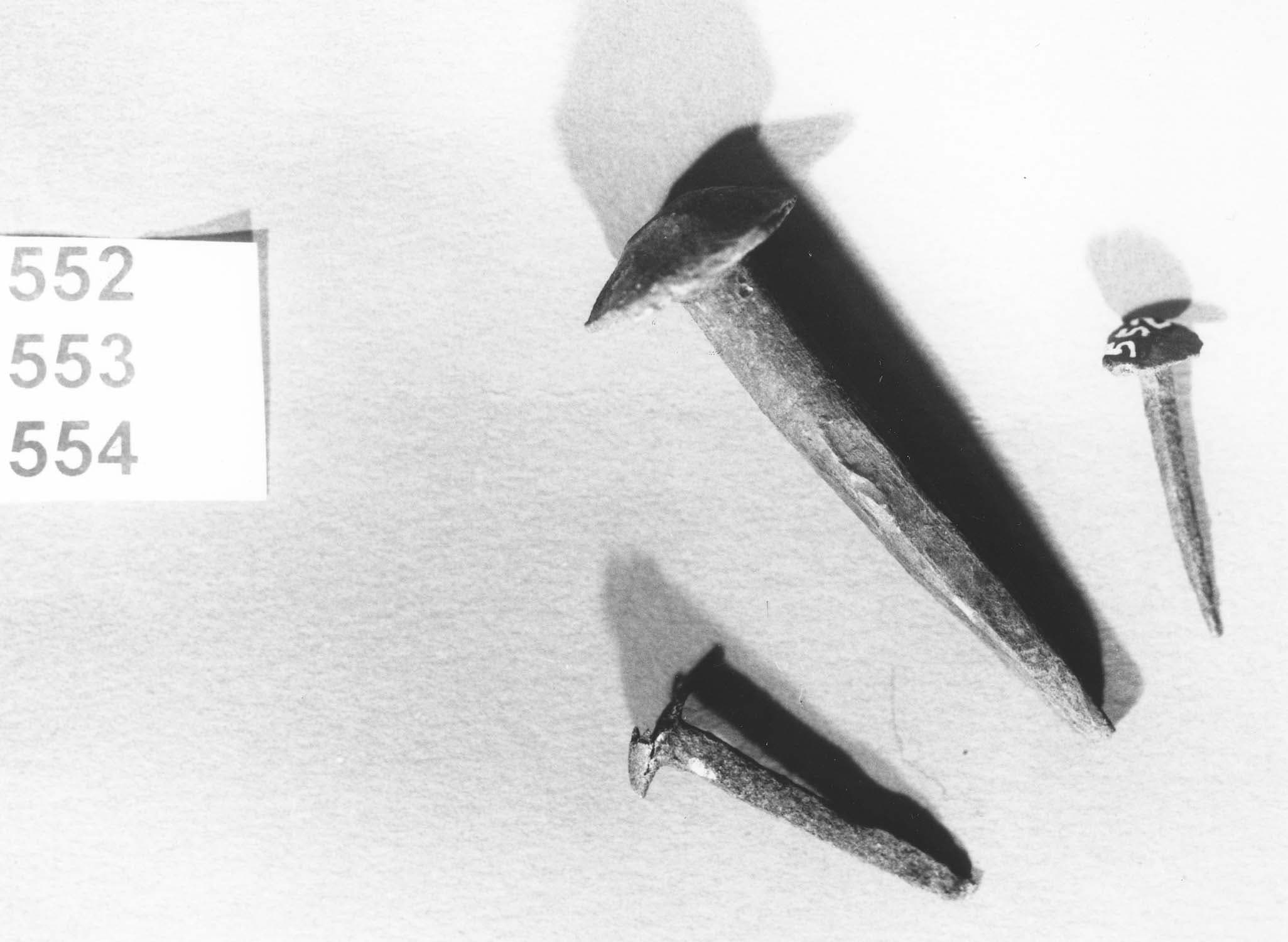 Clous (2) à tête ronde de la voûte lambrissée du transept et fragment de clou à tête ronde de la charpente du transept