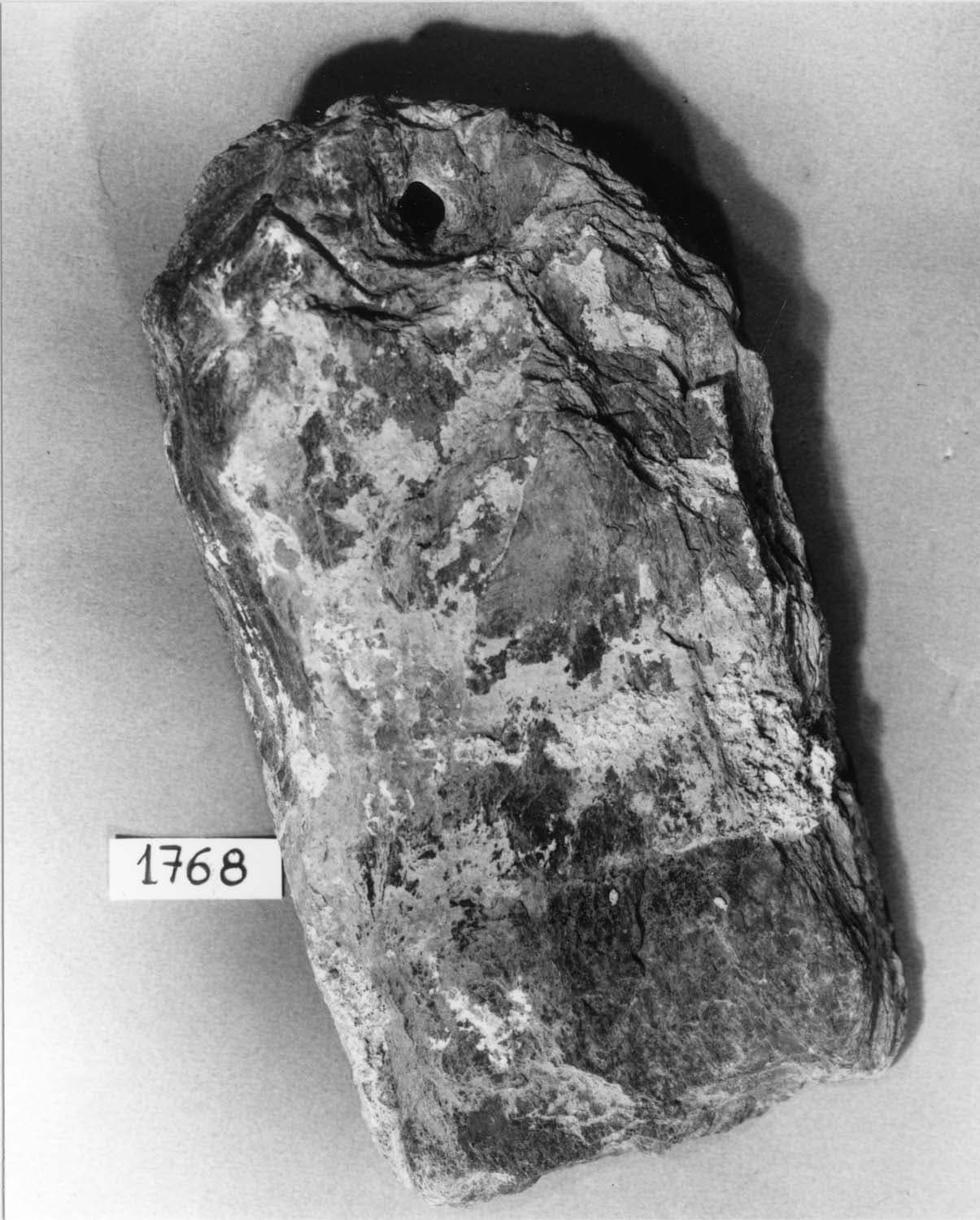 POP | Plateforme ouverte du patrimoineLauze en schiste de Caumont-l'Éventé (?) déposée dans les combles et correspondant aux traces de l'ancienne couverture romane encore visible dans le mur de la tour de croisée
